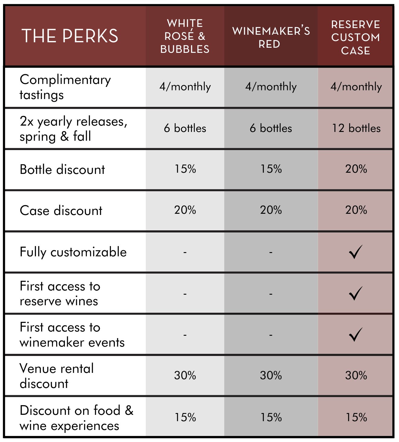 As a wine club member, you’ll enjoy exclusive benefits—access to limited-production wines, complimentary tastings, club-only varietals, special discounts, member events, and more.